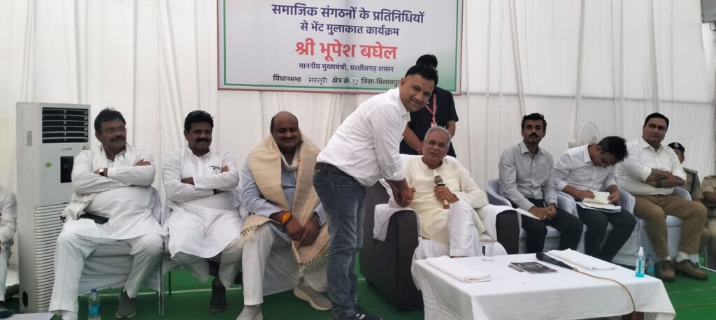 बिलासपुर जिले के मस्तुरी विधानसभा क्षेत्र के सीपत में भेंट मुलाकात कार्यक्रम में पहुंचे मुख्यमंत्री भूपेश बघेल ने प्रेस क्लब के अध्यक्ष वीरेंद्र गहवई को जन्मदिन की बधाई दी, और प्रेस क्लब अध्यक्ष की मांग पर सीएम ने पत्रकारों के आवास के लिए जल्द जमीन देने का आश्वासन दिया।