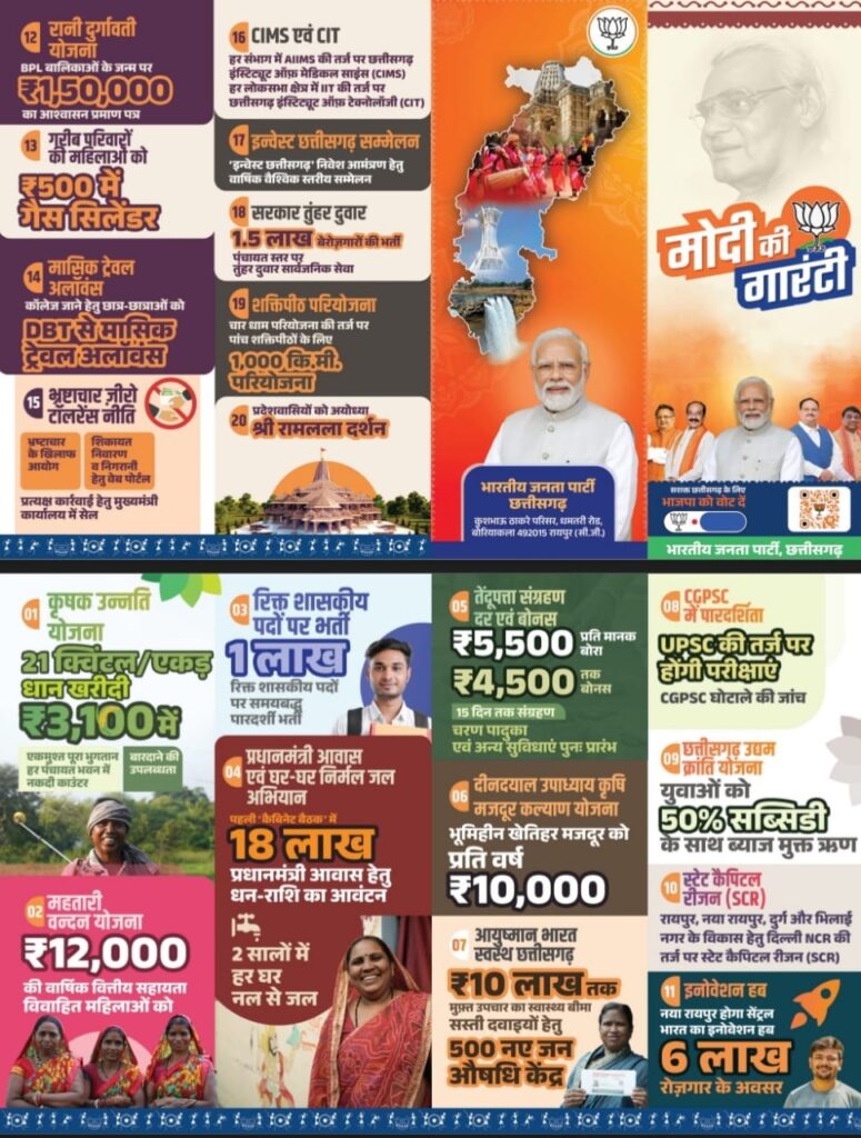 केंद्रीय गृहमंत्री अमित शाह ने किसानों, मजदूरों, महिलाओं और विद्यार्थियों सहित सभी वर्गों का ध्यान रखते हुए तैयार किए गए घोषणा पत्र को जारी करते हुए विश्वास दिलाया कि छत्तीसगढ़ को विकसित और समृद्धिशाली राज्य बनाने में भाजपा कोई कसर बाकी नहीं रखेगी। किसानों से 3100 रुपए प्रति क्विंटल की दर पर प्रति एकड़ 21 क्विंटल धान खरीदी जाएगी। समर्थन मूल्य की कीमत बोनस सहित एकमुश्त मिलेगी। इसके अतिरिक्त वर्ष 2016-17 एवं 2017-18 का बकाया बोनस 300 रुपए प्रति क्विंटल की दर से इसी वर्ष राष्ट्रीय सुशासन दिवस 25 दिसंबर को दिया जाएगा। प्रत्येक भूमिहीन खेतिहर मजदूरों को सालाना 10 हजार रुपए की आर्थिक सहायता दी जाएगी। विवाहित महिलाओं को सालाना 12000 रुपये मिलेगा। यूपीएससी की तर्ज पर पीएससी की परीक्षाएं पूरी पारदर्शिता के साथ होंगी। 500 रुपए में गैस सिलेंडर दिया जाएगा। 50 फीसदी सब्सिडी के साथ युवाओं को उद्यम के लिए ब्याज मुक्त ऋण दिया जाएगा। भाजपा संकल्प पत्र में शामिल प्रमुख बिंदु इस प्रकार हैं-