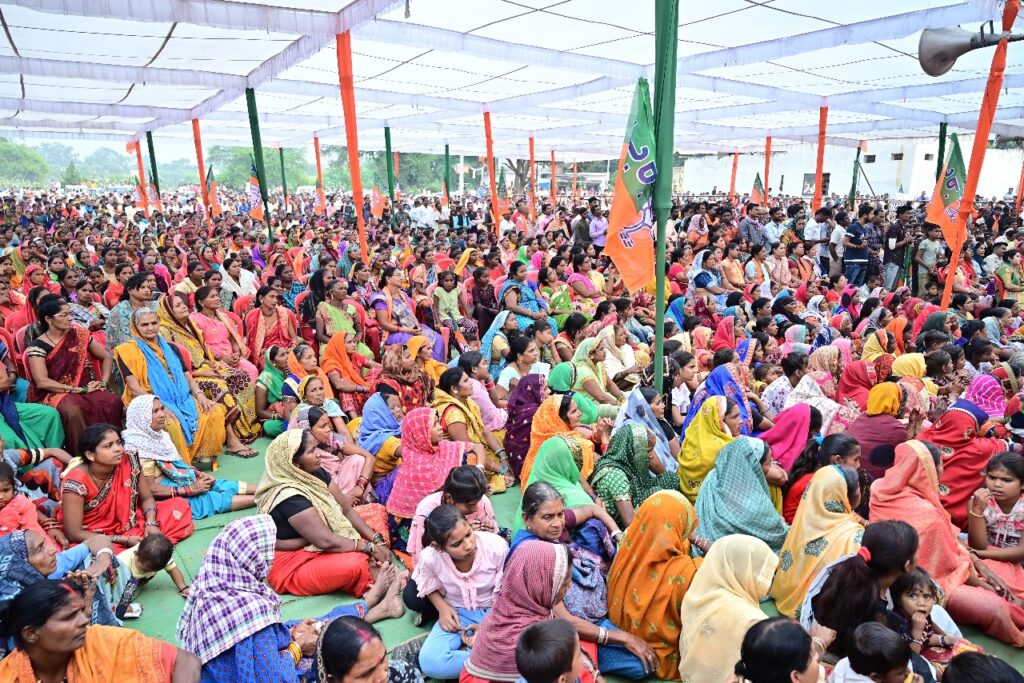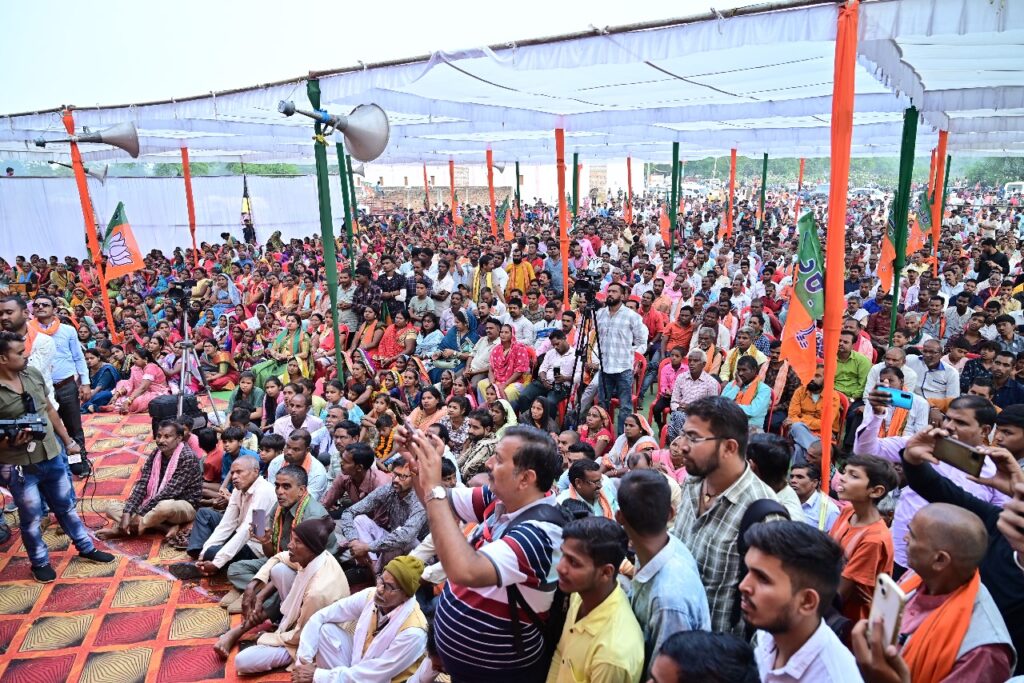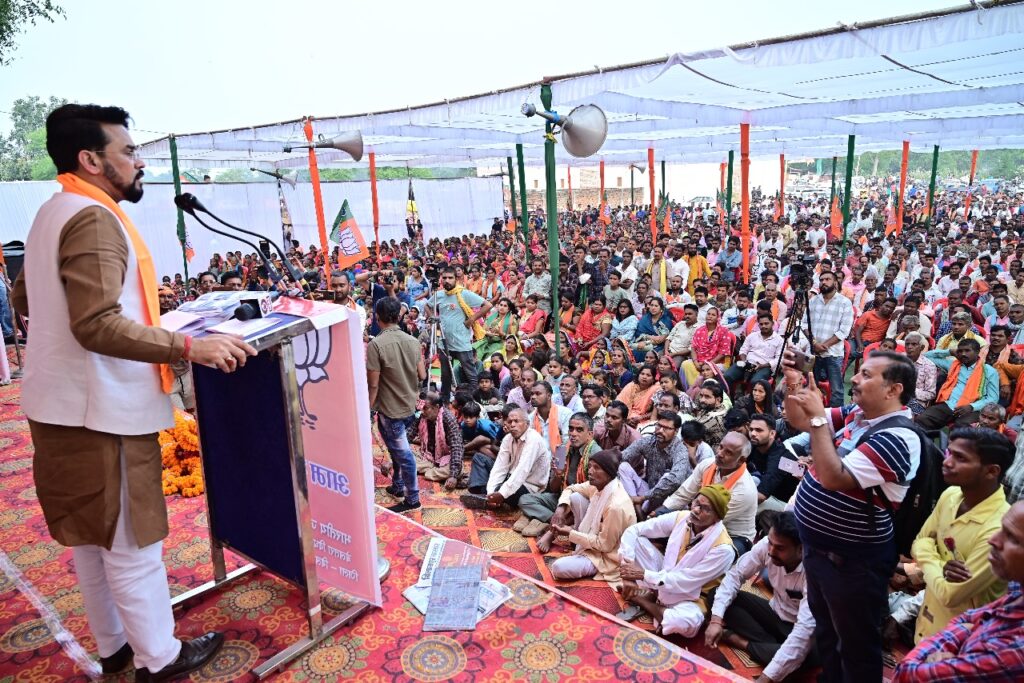 केंद्रीय मंत्री अनुराग ठाकुर आज बेलतरा विधानसभा क्षेत्र के पौसरा ग्राम में विशाल आम सभा को संबोधित किए,