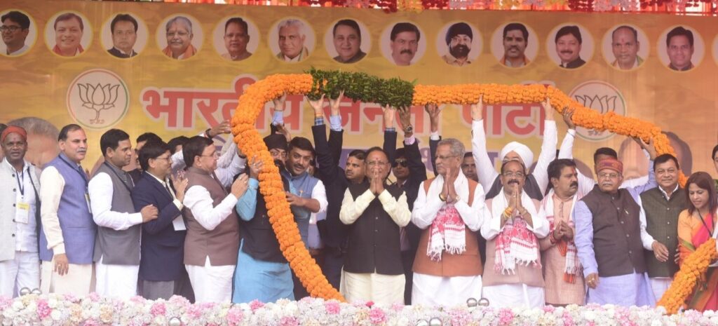 छत्तीसगढ़ के प्रदेश प्रभारी श्री ओम माथुर ने सभी कार्यकर्ताओं को प्रणाम करते हुए कहा कि जब मैं पहली बार प्रभार मिलने के बाद छत्तीसगढ़ आया तो लोग कहते थे कि मध्य प्रदेश और राजस्थान में तो सरकार बन सकती है लेकिन छत्तीसगढ़ में नहीं लेकिन जब मैं राज्य का दौरा किया। कार्यकर्ताओं की नब्ज टटोली तो सरकार के प्रति इतना गुस्सा था कि मुझे विश्वास हो गया कि सरकार बना लूंगा । उन्होंने कहा कि हमें छत्तीसगढ़ की सभी 11 सीटेंजितनी है आगे 3 महीने तक हम ना सोएंगे ना बैठेंगे ना विश्राम करेंगे काम करेंगे ताकि मोदी जी की सरकार केंद्र में फिर बन सके पूरी दुनिया मोदी जी की को मानने लगी है भाजपा के प्रदेश अध्यक्ष श्री किरण देव ने कहा जिस तरह आप लोग निष्ठा पूर्वक दिन-रात एक कर राज्य सरकार बने हैं इस तरह काम कर हमें मोदी जी को जिताना है हमने जनता से डबल इंजन की सरकार की बात कह कर सत्ता में आए हैं और यह तभी संभव होगा जब हम अपने यहां से सभी 11 सीटे जीत कर मोदी जी के नेतृत्व फिर से केंद्र में सरकार बनाएंगे। समारोह को उपमुख्यमंत्री द्वारा विजय शर्मा एवं अरुण साव ने भी संबोधित किया। श्री अरुण साव ने कहा की कार्यकर्ताओं की मेहनत से हमें छत्तीसगढ़ में ऐतिहासिक जीत मिली है ।आपने बहुत संघर्ष किया उत्पीड़न झेली, लाठी खाई तभी सरकार बन पाई है । सत्ता हमारे लिए लोगों की सेवा का एक जरिया भर है। हम जनता का काम करते रहेंगे।