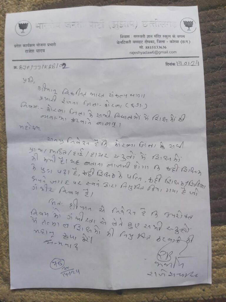 भारतीय जनता पार्टी के प्रदेश कार्यक्रम योजना प्रभारी व भाजपा युवा मोर्चा के पूर्व प्रदेश मंत्री राजेश यादव ने विकसित भारत संकल्प यात्रा शिविर रंजना में जिला कलेक्टर कोरबा से सभी विद्यालयों में शिक्षकों की व्यवस्था की मांग किया है।