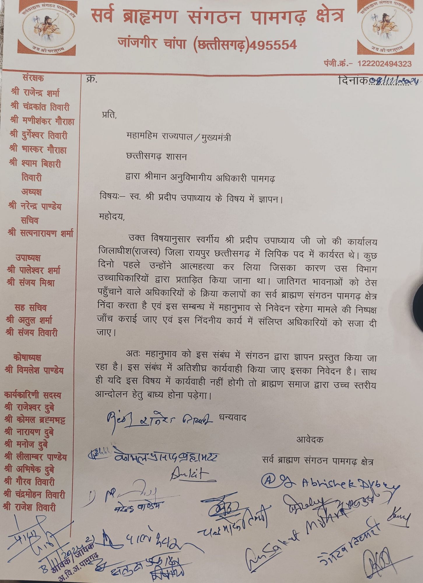 सर्व ब्राह्मण संगठन पामगढ़ क्षेत्र के पदाधिकारियों ने स्वर्गीय प्रदीप उपाध्याय (लिपिक- कार्यालय जिलाधीश, राजस्व जिला रायपुर) को मानसिक रूप से प्रताड़ित कर आत्महत्या के लिए बाध्य करने वाले उच्चाधिकारियों के विरुद्ध कड़ी कार्यवाही करने के संबंध में महामहिम राज्यपाल व मुख्यमंत्री के नाम पर शुक्रवार को अनुविभागीय अधिकारी पामगढ़ को ज्ञापन सौंपा है,साथ ही ज्ञापन में यह ज़िक्र भी किया गया है कि ‘स्व: प्रदीप उपाध्याय को आत्महत्या के लिए उकसाने/उन्हे मानसिक रूप से प्रताड़ित करने वाले आरोपियों के खिलाफ यदि जल्द ही कारवाई नहीं होती है तो संगठन द्वारा उग्र आंदोलन किया जाएगा।’