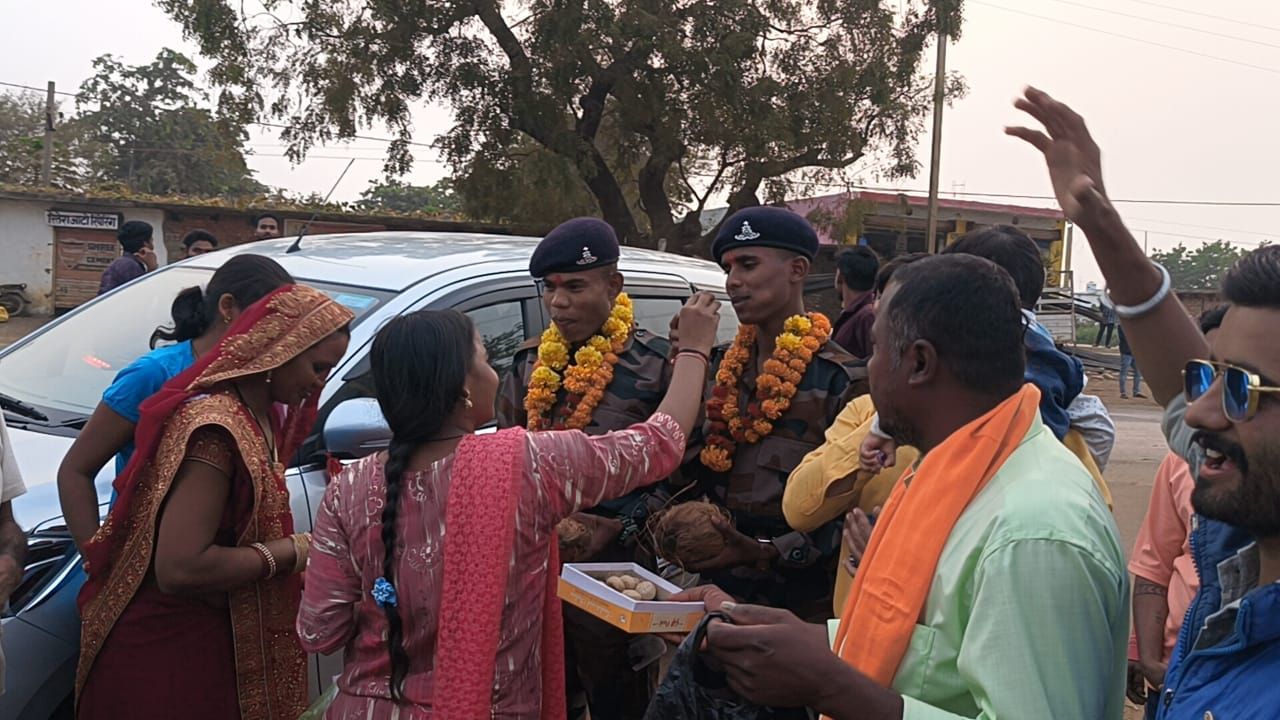 गांव पहुंचने के पूर्व मेंऊ भाठा मोड़ पर ही उनके परिवार व मित्र सभी पहुंच चुके थे और जवानों के आते ही आतिशबाजी, फूल-मालाएं पहनाकर व मिठाईयां खिलाकर लोगों ने जोरदार स्वागत किया इस दौरान गांव के सरपंच सुरेश कुमार तिवारी भी माला पहनाकर जवानों का अभिनंदन किया।