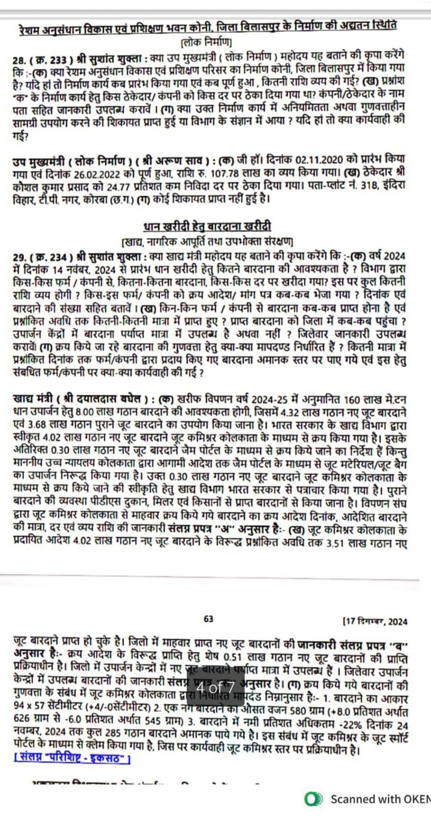 विधानसभा के शीतकालीन सत्र के दूसरे दिन बेलतरा विधायक सुशांत शुक्ला ने बिलासपुर में संचालित अमृत मिशन और धान खरीदी के लिए बारदाने के संबंध में पूछा सवाल। विधायक श्री शुक्ला ने नगर निगम बिलासपुर द्वारा खूंटाघाट बांध से लाकर शहर में सप्लाई की जारी पानी की योजना अमृत मिशन पर सवाल पूछा,जिस पद उप मुख्यमंत्री और नगरीय प्रशासन विभाग के भारसाधक मंत्री श्री अरूण साव ने दिया जवाब। विधायक बेलतरा ने सवाल किया की, अमृत मिशन के तहत कितना राशि खर्च की गई है,चिन्हित मार्ग पर पाइपलाइन बिछाई गई है की नहीं और अनियमितता या गुणवत्ता के संदर्भ में सवाल पूछा,जिसका जवाब देते हुए उप मुख्यमंत्री श्री अरूण साव ने बताया की 4 अक्टूबर 2017 से कार्य प्रारंभ किया गया था,मुंबई की इंडियन ह्यूम पाइप कंपनी द्वारा काम किया गया था,प्रोजेक्ट 2020 में पूरा होना था मगर फरवरी 2024 में पूरा किया गया है और 201.14 करोड़ राशि खर्च की गई है। इसी तरह धान खरीदी के लिए बारदाने की उपलब्धता और आवश्यकता और किस प्रकार खरीदा गया है इसकी जानकारी मांगी,जिस पर मंत्री श्री दयालदास बघेल ने जानकारी दिया। इसके अलावा स्मार्ट सिटी मिशन और कोनी में रेशम अनुसंधान विकास और प्रशिक्षण भवन के संबंध में सवाल पूछा।