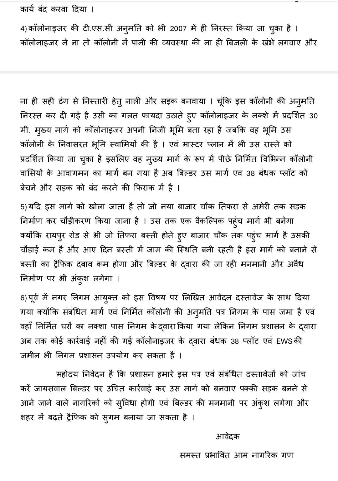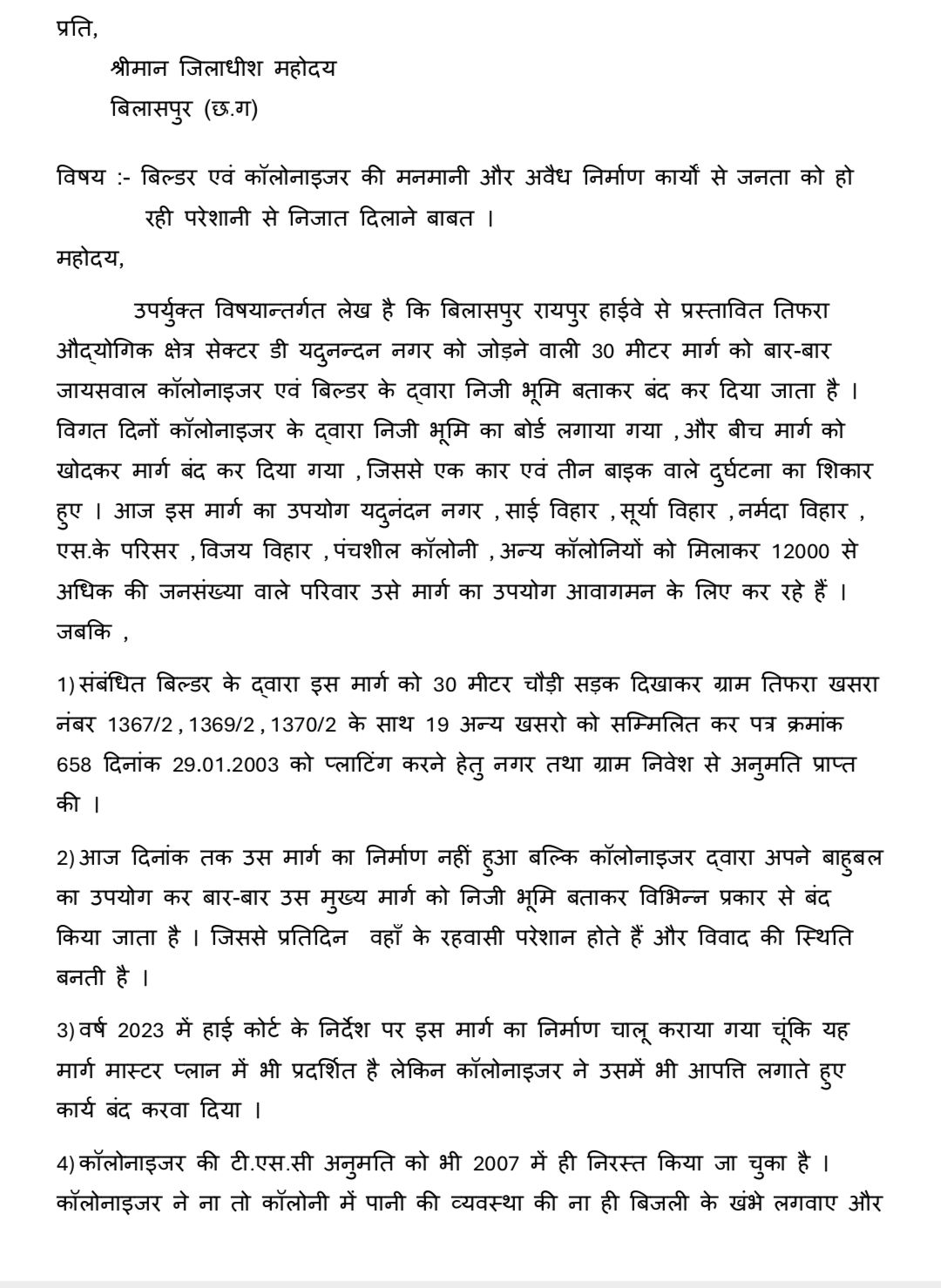 रायपुर रोड तिफरा से सेक्टर डी यदुनंदन नगर को जोड़ने वाली मुख्य सड़क को जायसवाल बिल्डर के द्वारा बार बार खोदकर आम नागरिक को परेशान किया जाता है इसी समस्या के निराकरण के लिए आज यदुनंदन नगर, साईं विहार, विजय विहार, एस के परिसर के नागरिक कलेक्टर को ज्ञापन देने पहुंचे, नागरिकों ने बताया कि 2003 में बिल्डर जायसवाल ने इस मार्ग को 30 मीटर चौड़ा दिखाकर जो प्रस्तावित सेक्टर डी में जाकर मिलती है अपनी भूमि का टी एंड सी कराया, 2007 तक बिल्डर ने ना तो रोड बनाई, ना नली, ना बिजली की कोई व्यवस्था की गई, इसलिए टी एंड सी ने उनकी कॉलोनी पर जुर्माना लगाया, ना पटने की शर्त पर 2014 में उनके टी एंड सी प्रोजेक्ट को निरस्त कर दिया, उसी का फायदा उठाते हुए बिल्डर अब उस 100 फिट मार्ग को अपनी निजी संपत्ति बताकर अन्य कॉलोनी वालों के लिए रास्ता बंद कर रहा है, जबकि वह मार्ग मास्टर प्लान में भी दर्शाया जा चुका है, 2023 में हाईकोर्ट के आदेश पर उस मार्ग को बनाया गए। किन्तु बिल्डर के द्वारा पुनः मार्ग को खुद दिया गया। चुकी उस मार्ग का प्रयोग विगत कई वर्षों से 12000 जनसंख्या वासी करते आ रहे है।