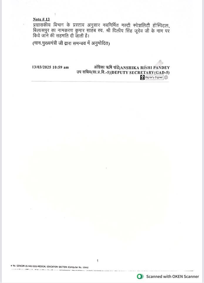 कोनी स्थित नवनिर्मित मल्टी स्पेशिलिटी हाॅस्पिटल अब पूर्व केंद्रीय मंत्री और बिलासपुर लोकसभा क्षेत्र के सांसद रहे भाजपा के दिग्गज नेता दिलीप सिंह जूदेव के नाम से जाना जाएगा। बेलतरा विधायक सुशांत शुक्ला की मांग पर मुख्यमंत्री श्री विष्णुदेव साय ने मल्टी स्पेशिलिटी हाॅस्पिटल को दिलीप सिंह जूदेव के नाम पर करने का निर्णय लिया है। मुख्यमंत्री के समन्वय अनुमोदित करने के बाद सामान्य प्रशासन विभाग ने आदेश जारी किया है। विदित है की पूर्व केंद्रीय मंत्री रहे दिलीप सिंह जूदेव का छ.ग. ही नहीं बल्कि पूरे देश अपना एक प्रभाव और जनाधार था। स्व. जूदेव का नाम अविभाजित म.प्र. से लेकर छ.ग.तक में भाजपा के बड़े नेताओं में शुमार था। आपरेशन घर वापसी अभियान चलाकर दिलीप सिंह जूदेव ने पूरे देश में धर्मांतरण के खिलाफ बिगुल फूंका था। छ.ग. राज्य बनने के बाद तत्कालीन कांग्रेस सरकार को सत्ता से बाहर करने में भी दिलीप सिंह जूदेव की महत्वपूर्ण भूमिका थी। स्व. जूदेव जांजगीर,बिलासपुर लोकसभा के सांसद के अलावा राज्यसभा के भी सदस्य रहे हैं।