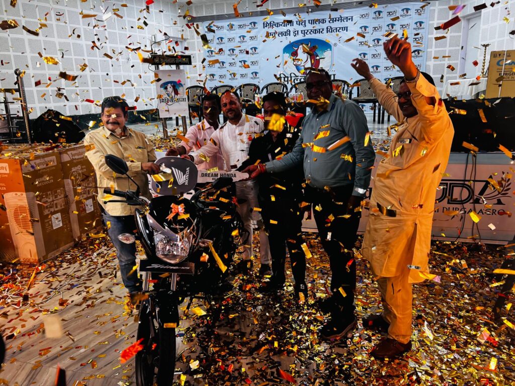 मिल्कियाना पशु आहार के उत्पादन की जानकारी देते हुए डायरेक्टर प्रदीप अग्रवाल ने कहा है कि उन्होंने सबसे प्रारंभ में 10 साल पहले 50 टन से पशु आहार उत्पादन की शुरुआत की थी। आज मिल्कियाना पशु आहार का 15 राज्यों में विस्तार हुआ । डायरेक्टर प्रदीप अग्रवाल ने कहा है कि पशुपालक सम्मेलन को लेकर पशु आहार में 2 महीने की स्कीम चलाई थी ।जिसमें एक कूपन किसानों तथा पशुपालकों को दिया गया था आज इस लकी ड्रा में पहला पुरस्कार आकर्षक बाईक के साथ ही स्मार्ट टीवी , रेफ़ेरिजरेटर , सिम्फनी कूलर , इंडक्शन कूकर आकर्षक उपहार पशुपालकों को दिए गए । मिल्कियाना पशु आहार के डायरेक्टर प्रदीप अग्रवाल ने बताया कि प्रथम पुरस्कार के रूप में लोखंडी के शरद अवस्थी को हीरो होंडा शाईन बाइक पुरस्कार के रूप में दी गई है। द्वितीय पुरस्कार नागोई गांव के बजरंग को फ्रिज तथा तीसरा पुरस्कार अकलतरा के पशुपालक गोलू यादव को एलइडी स्मार्ट टीवी प्रदान की गई है। इसके अलावा पांच सिंफनी कूलर 5 इंडक्शन और 20 सेलिंग फेन पशुपालक विजेताओं को प्रदान किया गया है। इसके अलावा आए हुए सभी पशु पालको को उपहार प्रदान किए गए । आज के कार्यक्रम में विशेष रूप से महिलाएं भी शामिल रही। आज के पशुपालक सम्मेलन में प्रमुख रूप से जिला दूध उत्पादक संघ के पूर्व अध्यक्ष अशोक शर्मा , पशु चिकित्सक अजय अग्रवाल , जिला दुग्ध उत्पादक संघ के अध्यक्ष मुकेश मिश्रा, मिल्कीयाना पशु आहार के डायरेक्टर प्रदीप अग्रवाल ने पशुपालक विजेताओं को पुरस्कार बांटे।