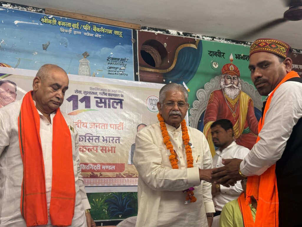 पूर्व विधानसभा अध्यक्ष धरमलाल कौशिक ने प्रधानमंत्री नरेंद्र मोदी के गौरवशाली 11 वर्ष पूर्ण होने के अवसर पर तिफरा सिरगिट्टी मंडल के सामुदायिक भवन में आयोजित ” संकल्प सेवा कार्यकम में शामिल हुए। इस अवसर पर प्रधानमंत्री नरेन्द्र मोदी के नेतृत्त्व में केंद्र सरकार के 11 साल की उपलब्धियों पर विस्तार से चर्चा की। इस मौके पर उन्होंने कार्यक्रम को सम्बोधित करते हुए कहा कि प्रधानमंत्री मोदी के नेतृत्व में भारत ने बीते 11 वर्षों में आत्मनिर्भरता, सुरक्षा, स्वच्छता, तकनीकी नवाचार और वैश्विक सम्मान के नए आयाम गढ़े हैं। और ‘संकल्प से सिद्धि’ की ओर कदम बढ़ाया है, जिसमें हर नागरिक की भागीदारी रही है। जो काम पिछले 75 वर्षों में नहीं हो पाए, वे प्रधानमंत्री नरेंद्र मोदी ने अपने 11 साल के कार्यकाल में करके दिखाए हैं। उन्होंने कहा कि देश की सुरक्षा, अर्थव्यवस्था, गरीब कल्याण और अंतरराष्ट्रीय स्तर पर भारत की प्रतिष्ठा को नई ऊंचाई देने का कार्य मोदी सरकार ने किया है। श्री कौशिक ने यह भी कहा कि देश के दुश्मनों से निपटने और आतंकवाद के खिलाफ घर में घुसकर मारने की नीति केवल प्रधानमंत्री मोदी जैसे नेतृत्व में ही संभव है।