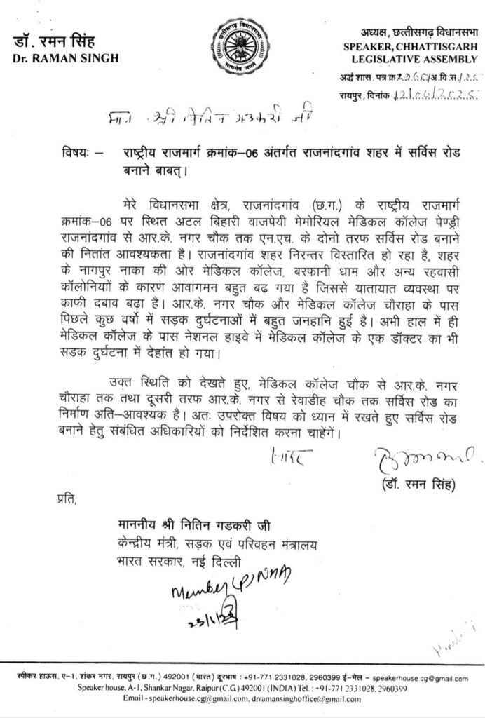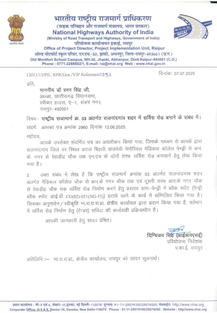 राजनांदगांव में बढ़ते ट्रैफिक को ध्यान में रखकर परिवहन की सुविधाओं के विस्तारीकरण के लिए राष्ट्रीय राजमार्ग क्रमांक 53 (पूर्व में राष्ट्रीय राजमार्ग क्रमांक 6) पर स्थित अटल बिहारी वाजपई मेमोरियल मेडिकल कॉलेज पेंड्री से आरके नगर चौक तक दोनों तरफ सर्विस रोड बनाने की आवश्यकता पर गंभीरता से विचारकर छत्तीसगढ़ विधानसभा अध्यक्ष और राजनांदगांव विधायक डॉ रमन सिंह ने केंद्रीय मंत्री सड़क एवं परिवहन मंत्रालय, नितिन गडकरी को 12 जून 2025 को पत्र लिखकर अवगत करवाया था। इसके साथ ही विधानसभा अध्यक्ष और राजनांदगांव विधायक डॉ रमन सिंह ने इस पत्र में यह आग्रह भी किया था कि राजनांदगांव में एनएच 53 पर बढ़े ट्रैफिक की स्थिति को देखते हुए मेडिकल कॉलेज चौक से आर.के. नगर चौराहा तक दोनों तरफ सर्विस रोड का निर्माण किया जाए। इसके साथ ही राजनांदगांव सांसद संतोष पाण्डे ने भी इस मार्ग पर सर्विस लेन निर्माण के लिए 14 जून 2025 को पत्र लिखकर केंद्रीय मंत्री से आग्रह किया था।