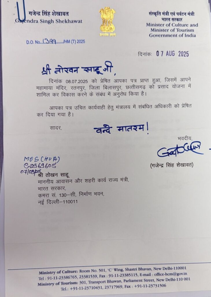 श्री शेखावत ने 07 अगस्त 2025 को भेजे पत्र में सूचित किया कि श्री तोखन साहू का अनुरोध मंत्रालय में संबंधित अधिकारी को उचित कार्यवाही हेतु प्रेषित कर दिया गया है। यह पहल महामाया मंदिर परिसर के धार्मिक, सांस्कृतिक एवं पर्यटन विकास को नई दिशा प्रदान करेगी।