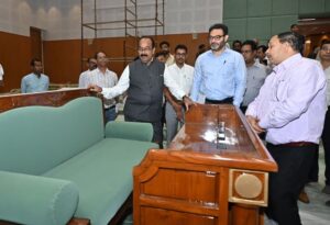 उप मुख्यमंत्री तथा लोक निर्माण मंत्री श्री अरुण साव ने आज नवा रायपुर में निर्माणाधीन छत्तीसगढ़ विधानसभा के नए भवन के अंतिम दौर के कार्यों का निरीक्षण किया। उन्होंने इस दौरान इसके लोकार्पण की तैयारियों का भी जायजा लिया। प्रधानमंत्री श्री नरेन्द्र मोदी आगामी 1 नवम्बर को राज्योत्सव के मौके पर विधानसभा के नए भवन का लोकार्पण करेंगे। आधुनिक व सर्वसुविधायुक्त इस भवन में छत्तीसगढ़ की संस्कृति और परंपरा की झलक दिखाई देगी। विधानसभा के सदन की सीलिंग में धान की बालियां उकेरी गई हैं। सदन के भीतर के ज्यादातर फर्नीचर बस्तर के शिल्पियों द्वारा बनाए गए हैं।