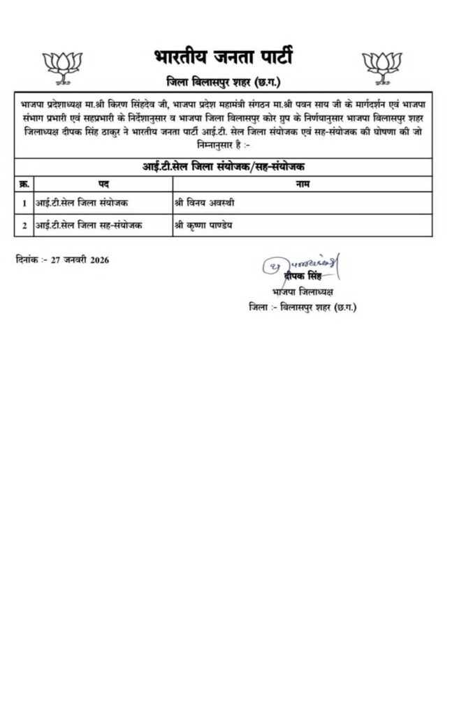 भाजपा प्रदेशाध्यक्ष मा.श्री किरण सिंहदेव जी, भाजपा प्रदेश महामंत्री संगठन मा.श्री पवन साय जी के मार्गदर्शन एवं भाजपा संभाग प्रभारी एवं सहप्रभारी के निर्देशानुसार व भाजपा जिला बिलासपुर कोर ग्रुप के निर्णयानुसार भाजपा बिलासपुर शहर जिलाध्यक्ष दीपक सिंह ठाकुर ने भारतीय जनता पार्टी आई.टी. सेल जिला संयोजक एवं सह-संयोजक की घोषणा की जो निम्नानुसार है :-
