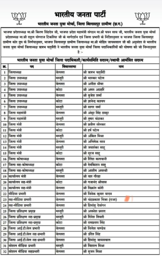 भाजपा बिलासपुर ग्रामीण जिला अध्यक्ष मोहित जायसवाल की अनुशंसा से भारतीय जनता युवामोर्चा जिला अध्यक्ष ऋषभ चतुर्वेदी ने भारतीय जनता युवामोर्चा जिला पदाधिकारियों की घोषणा हुई जिसमें युवामोर्चा में सक्रिय रहे चंद्र प्रकाश मिश्रा (राजा)को हस-मीडिया प्रभारी का दायित्व दिया गया।