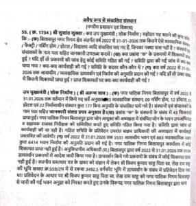वहीं डायवर्सन (भू-उपयोग परिवर्तन) के संबंध में बताया गया कि वर्ष 2022 से 31 जनवरी 2026 तक 7104 मामलों में आदेश जारी किए गए। अधिकांश मामलों में कोई शिकायत प्राप्त नहीं हुई है। हालांकि एक प्रकरण में समाचार पत्र में प्रकाशित जानकारी के आधार पर विजय कुमार साहू द्वारा खसरा नंबर 559/22 की 3492.5 वर्गफुट भूमि के डायवर्सन संबंधी मामला सामने आया, जिसमें जांच के बाद जारी भवन अनुज्ञा निरस्त कर संबंधित व्यक्ति के खिलाफ नगर पालिक निगम बिलासपुर थाना में एफआईआर दर्ज कराई गई है।